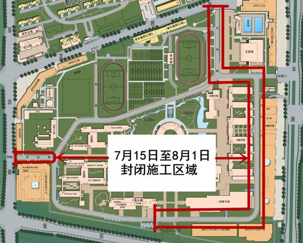 我校教学区环道维修改造工程已开工建设,目前正在进行环道东南区域雨水管网的施工。为保证施工安全、确保工程按期完工,同时尽可能减小对教学区内车辆通行的影响,故根据工程进度,计划对教学区环道进行分区域、分时间段实施封闭。7月15日至8月1日封闭施工的区域为(如图所示):